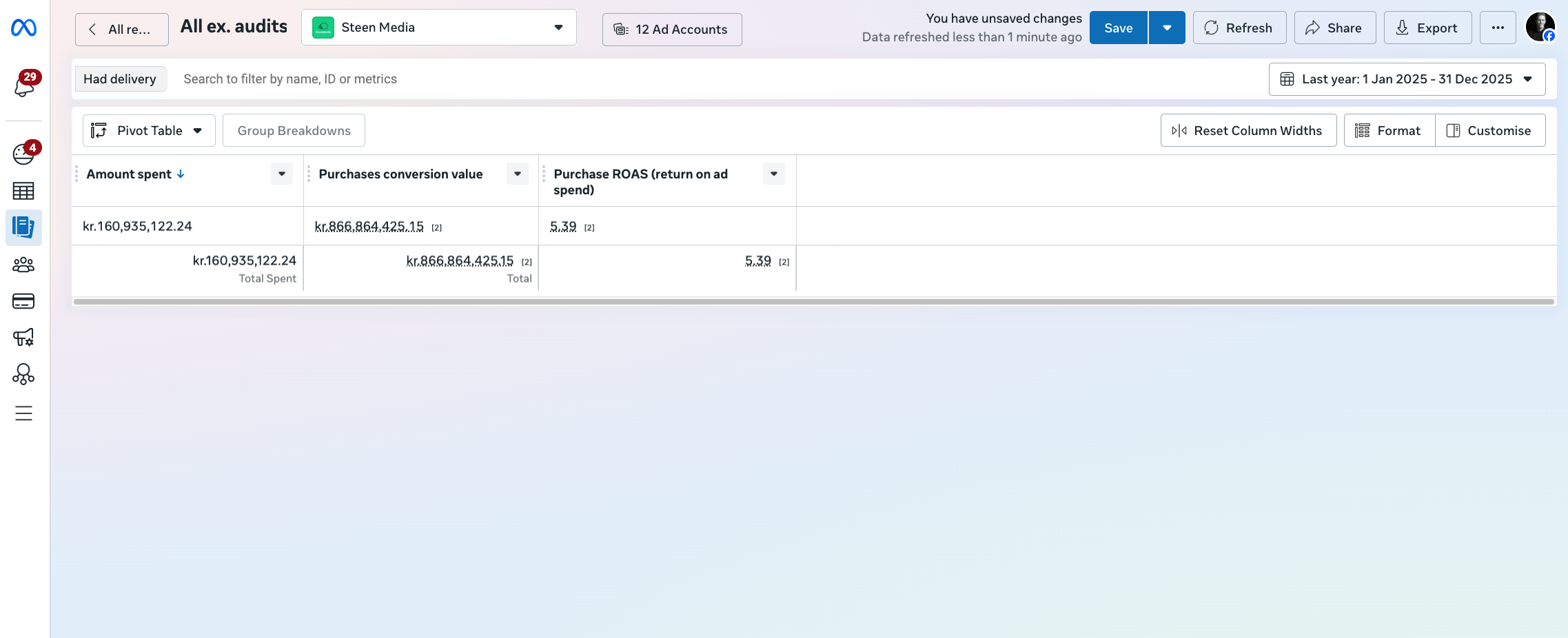Komplet gennemgang af annoncekonto. Kortsigtede og langsigtede optimeringsmuligheder. Input til kreativ strategi. Til dig der bruger +150.000,- om måneden på Meta annoncering.